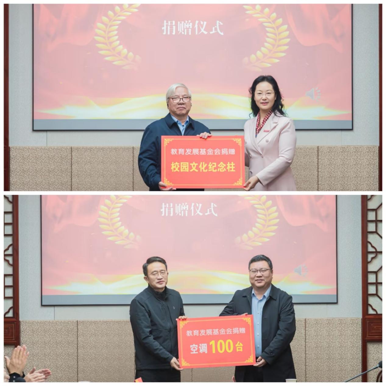 会议最后举行了捐赠答谢仪式,陈玉君、岳峰代表学校向以张惠洪、都樾为代表的基金会颁发捐赠牌,感谢基金会向学校捐赠校园文化纪念柱及100台空调设备,助力学校建设发展。